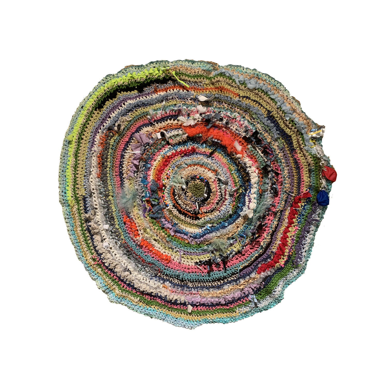 A rug made of materials found around my childhood home including (but not limited to): unfinished projects, old scraps of fabric, yarn, plastic wrappers, headphones, jewelry, feathers, rafia, shoelaces, beads, mail packaging. The disparate but elemental fibers become cohesive through crochet. It is an object that consumes and becomes its environment but also chronicles my personal history and compulsory retrospection during an abrupt homecoming during the pandemic. It also reflects a repetitive yet meditative process that holds my uncertainty and worry about what comes next.