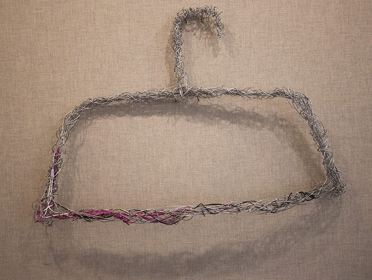 Gancho is a response to the overturning of Roe v. Wade. Made of a collection of metal coat hangers that intersect, this piece highlights the unity of pro-choice individuals who stand in resistance as their reproductive freedom is put in a state of limbo.
