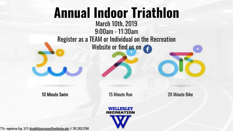 Swimming laps are 25-yards long, cycling leg is done on stationary bikes, running leg will be done on 200-meter track.