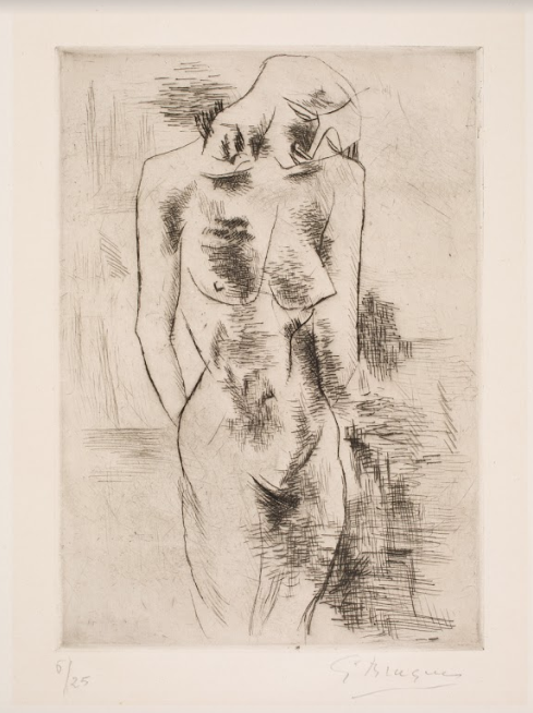 Etude de Nu was the first print Braque created. An edition of 25, this work illustrates Braque’s etching method. Varying line quality is evident in the etching, from the fine lines in the figure’s left thigh, to the thicker lines that Braque carved more deeply into the etching plate. Variations in darkness suggest Braque placed the plate in an acid bath for a second time, covering areas he wanted to remain lighter with an acid-resistant ground. Although Braque created most of the etching with one sharply-pointed tool, he switched to a double-pointed tool to create texture for some of the background areas. This work is one of a small number of Cubist etchings Braque created between 1908 and 1912, preceding his time as one of the first School of Paris artists to focus on printmaking in the aftermath of World War II.