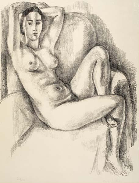 In 1917, Matisse moved to Southern France to distance himself from the sweep of World War I. During his stay in Nice (1917-1930), his primary subject became the female figure, shown without clothes or dressed in costume. Nude with Raised Arms in Armchair exemplifies his work with the female form during this period. In this lithograph, Matisse illustrates a female figure sitting in a chair with both arms raised above her head. She wears no clothing, and her hair is pulled back, prominently displaying her breasts and midsection. The woman’s left leg bends, while her right leg crosses over her left foot and drapes over the front of the chair.