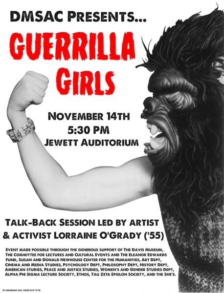 And they are coming to the Davis Museum for a special lecture at Jewett Auditorium on Thursday, November 14 at 5:30pm; and a gallery talk at the museum on Friday, November 15 at 1:30pm. The lecture will feature a performance by the Guerrilla Girls and will be followed by a talkback session led by the artist and activist, Lorraine O’Grady (Wellesley Class of ’55). During the gallery talk, the Guerrilla Girls will discuss the conception and creation of some of their most famous posters and projects that are part of the Davis Museum Collection. Sponsored by the Davis Museum Student Advisory Committee (DMSAC), both events are free and open to the public.