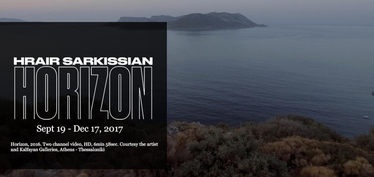 Shot by drone across a perilous expanse, Hrair Sarkissian’s two-channel video installation, Horizon (2016), charts one of the shortest and most common refugee routes from Kaş on the southwestern Turkish shore, across the Mycale Strait, to the island of Megisti on the edge of southeastern Greece. Sarkissian writes of this journey “into the unknown” as marked by extreme uncertainty wherein “there is just one line to hold on to: the horizon. A line that divides the blues of the water and the sky, the up and the down. It visualizes how close the future is, a starting point for building up hopes and dreams, a refuge for escaping the darkness of the present, while holding on to the memories of the past.” Born and raised in Damascus, Sarkissian trained in his father’s photographic studio, completed a BFA in Photography at the Gerrit Rietveld Academie, Amsterdam in 2010, and has lived and worked in London since 2011. Curated by Lisa Fischman, with generous support from the Maryam and Edward Eisler / Goldman Sachs Gives Fund on Art and Visual Culture in the Near, Middle, and Far East at the Davis Museum.