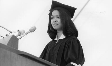 Addressing the graduates, their friends and families, and the Wellesley community were Marivic B. Mabanag, student speaker; Garry Trudeau, creator of Doonsbury cartoon strip and commencement address speaker; and Wellesley College acting President Dr. Carol Johnson Johns.