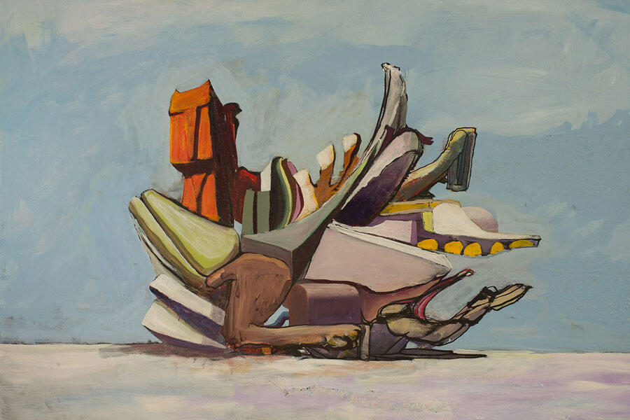 All of Chris Nau’s paintings in this exhibition begin on long train rides. Landscapes dissolve in collaged flashes of nature and rural, suburban, and urban scenes when experienced through the window of a moving train. Buildings and vehicles, plants and animals, seen briefly and in unexpected combinations, provide the inspiration for Nau’s sketches, which in turn act as the originating forms for his paintings.