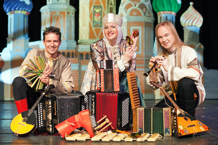 A performance by the Russian folk music group Zolotoj Plyos, with musicians Alexander Solovov, Elena Sadina, and Sergei Grachev, graduates of the Saratov State Conservatory. The group’s repertoire includes folk songs and instrumental pieces from various parts of Russia, Ukraine, Belarus, Moldova, Georgia, and other areas, and also features Gypsy music, Russian popular music, and Jewish music. The members of the ensemble play more than 30 Russian folk instruments, including the bayan, chromatic and diatonic accordions, balalaika, domra, guitar, zhaleika, clarinet, saxophone, various percussion instruments, and Russian bells.