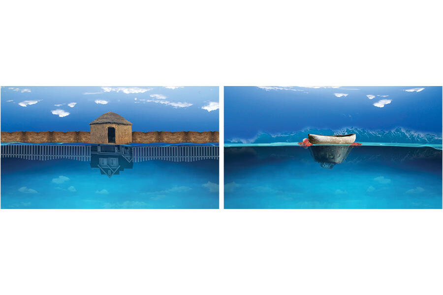 L: Fatimah Tuggar, Home’s Horizons 1, 2019. Computer montage diptych (inkjet on vinyl) 40 x 23 in., 40 x 23 in.