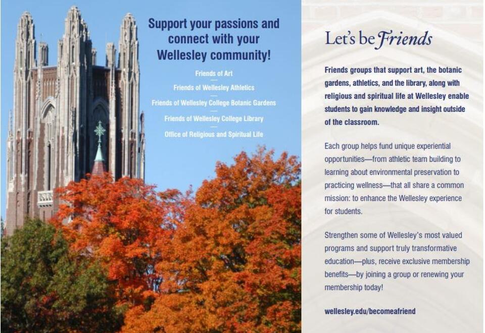 The Friends of Wellesley share a common mission: to enhance student engagement beyond the classroom by supporting a broad range of programs that make the Wellesley experience holistic and rich. Friends provide invaluable support for our students by funding activities such as athletic team building, arts enrichment, health and wellness staffing, and maintaining special collections.