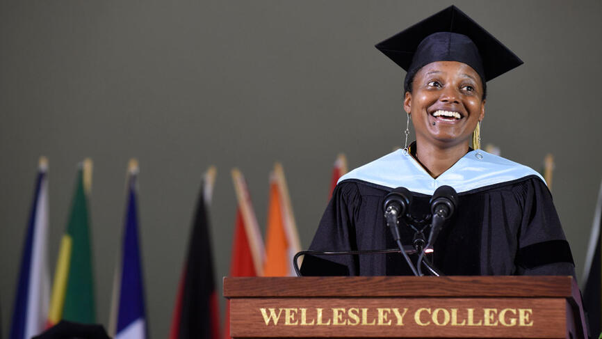 Tracy K. Smith, poet laureate of the United States and the Roger S. Berlind ’52 Professor in the Humanities and director of the creative writing program at Princeton University, speaks to the class of 2018 at Wellesley’s 140th commencement exercises. In closing her remarks, she asks the class of 2018 to “teach the world you are right now inheriting to love itself in a way it does not yet believe that it can.”