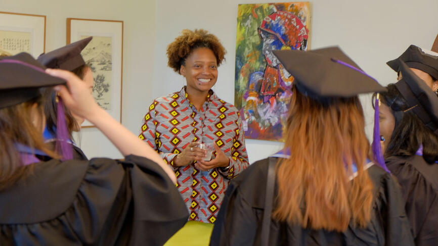 Wellesley commencement speaker Tracy K Smith gathers with students to robe for the procession.