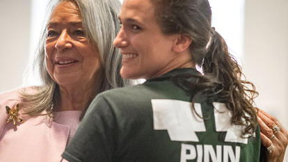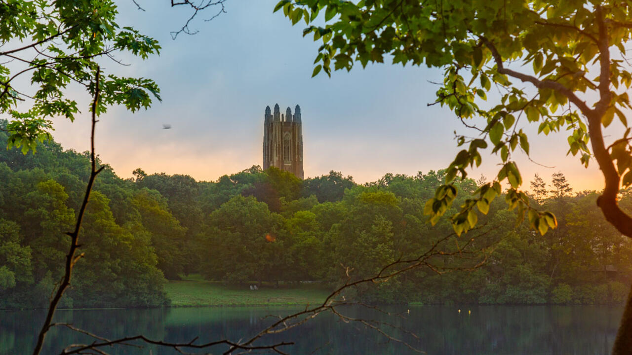 One of Wellesley College’s most iconic campus features, Galen Stone Tower, peeks through the trees in the early morning light. At 182 feet tall, the Tower can be seen from across campus and Lake Waban.