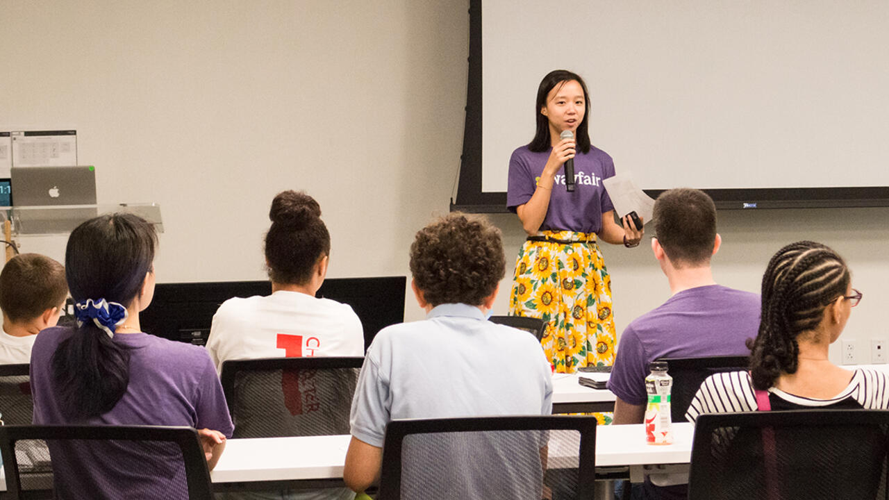 Photo: Karina Lin ’19 speaks to a classroom of students at Wayfair's Community Coding Day.
