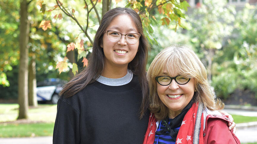 Many happy reunions marked the weekend, including this moment between V.J. Jones ’22 and her mother, Laura Jones, captured during registration on Friday in Lulu. Photo: Mehar Bhatia ’22