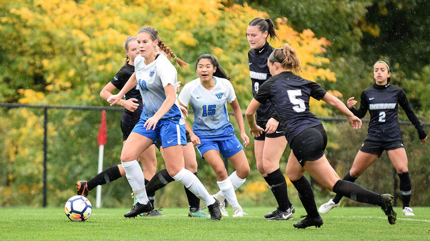 Hannah Knoll ’20 looks to control the ball during the second half of the Wellesley-Emerson soccer game this weekend. The team ran through the rain and rallied for a late equalizer, as Kelly Hoover ’19 scored her first career goal with six minutes left in regulation to help the Blue to a 1-1 tie. Photo: Julia Monaco ’19