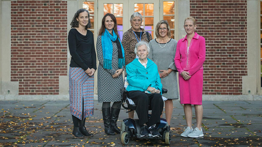 Wellesley welcomed the third class of inductees to the Wellesley Athletics Hall of Fame on Saturday evening in the Alumnae Hall Ballroom. Left to right, they are Sarah Hilgenberg ’00, Katie Antypas ’99, Betsy Jordan ’59, Amy Ayres Parratto ’83, Jennifer Kegel ’88, and (front) Louise O’Neal, director of athletics and department chair from 1990 to 2006. The awardees shared stories of their athletic achievements with family, friends, and current student-athletes at the awards dinner. Photo: Frank Poulin