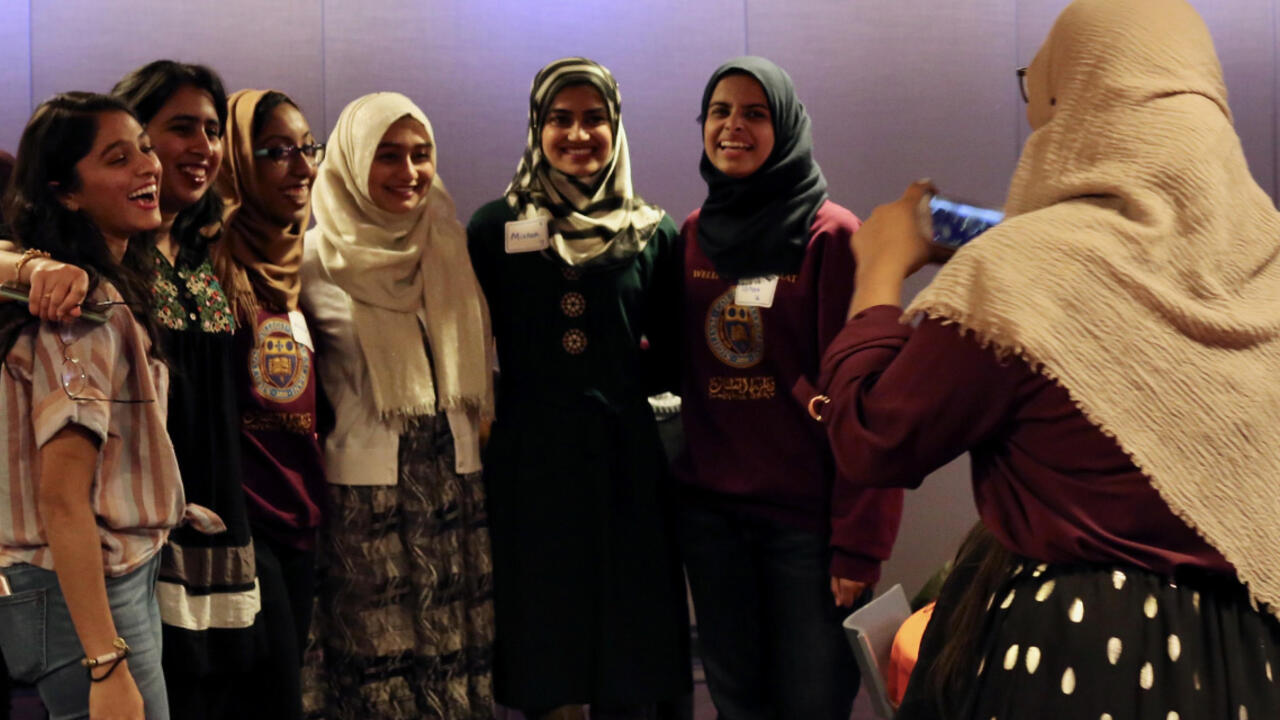 Photo: Wellesley students and alumnae celebrate the 30th anniversary of Al-Muslimat at Wellesley. [From left to right] Sarah Moinuddeen '19, Sidikha Ashraf '19, Nusrat Jahan ’16, Faiza Aslam '19, Misbah Aslam ’13, Tahani Chaudhry ’16, and Zainab Jafiq '20