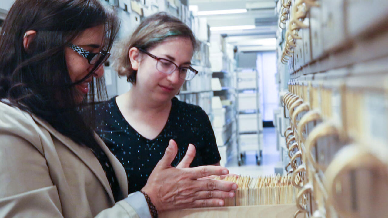 Photo: Lisa Rodensky (left) looks through the Houghtons' research cards for the Wellesley Index to Victorian Periodicals with College archivist Rebecca Goldman (right) in the Wellesley College Archives.
