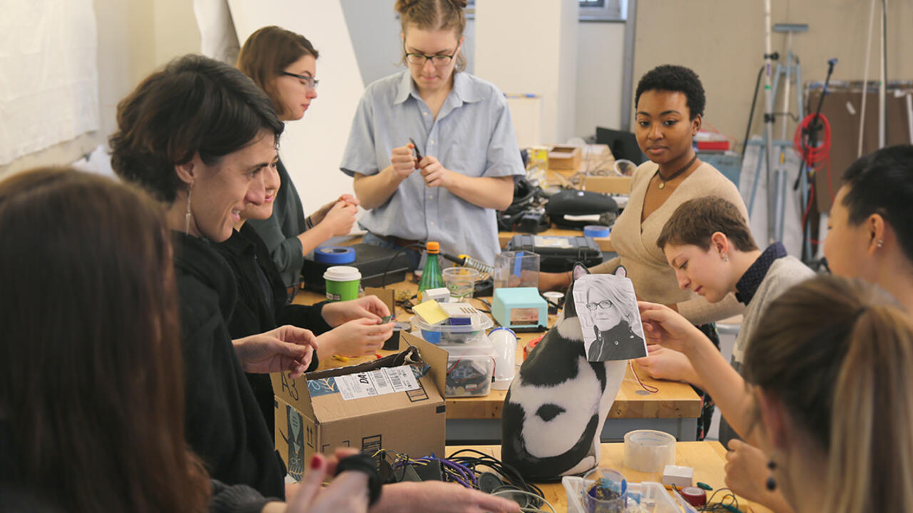 Photo: The Calico Collective works on their installation with Daniela Rivera (left).