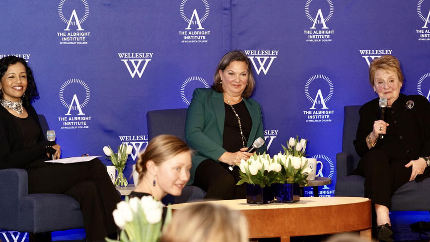 On January 22, Secretary Albright was joined by Victoria Nuland (center), assistant secretary of state for European and Eurasian affairs at the U.S. State Department (2013–2017) and senior counselor at the Albright Stonebridge Group, and Smitha Radhakrishnan (left), Luella LaMer Slaner Associate Professor of Women’s Studies and associate professor of sociology at Wellesley, for a dialogue titled “Leadership on a World Stage.”