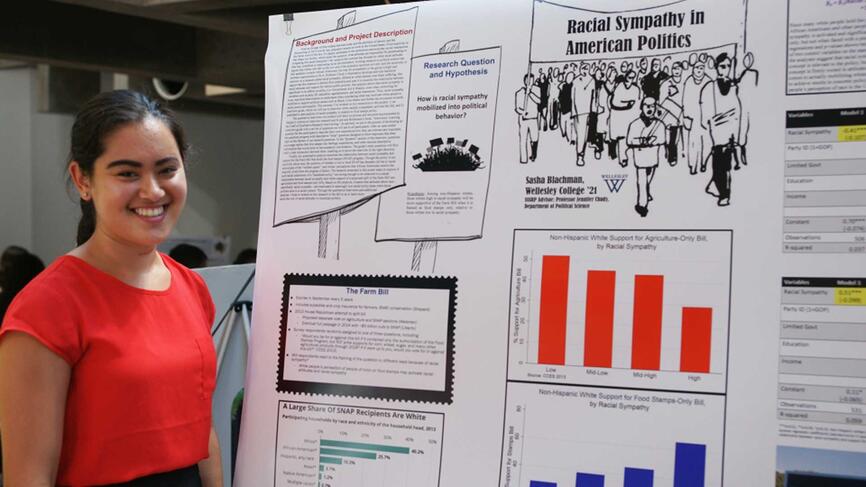 Jennifer Chudy, Knafel Assistant Professor of Social Sciences and assistant professor of political science, and Sasha Blachman ’21 both started at Wellesley in 2017. When Blachman learned about Chudy’s research into politics and racial sympathy, she quickly recognized how her own interests in race and politics intersected with Chudy’s work. “From the beginning of my freshman year I knew I really wanted to take a class with her,” Blachman said. “I have been certain about my political science path since the start of college, and she stood out to me as a great mentor.”