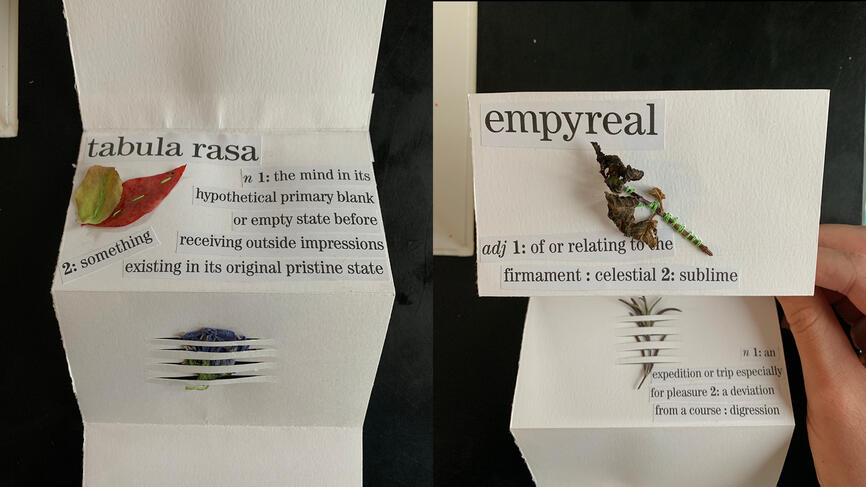 Abby Martinage ’24 participated in the Mindful Winter Walk and Group Book Making seminar, sponsored by the Book Arts Program, Library and Technology Services, and the Paulson Ecology of Place Initiative. Participants were instructed to go outdoors before the seminar and collect items to use in a book. “I was just walking around my mom’s garden and finding things to put in a book, so I have a bunch of mostly dried-up herbs,” Martinage said. When the students joined the seminar, Katherine McCanless Ruffin, director of the book studies program, provided a handout on how to make a book and walked participants through the project. “I really just enjoyed having the time to do something with my hands,” Martinage said.