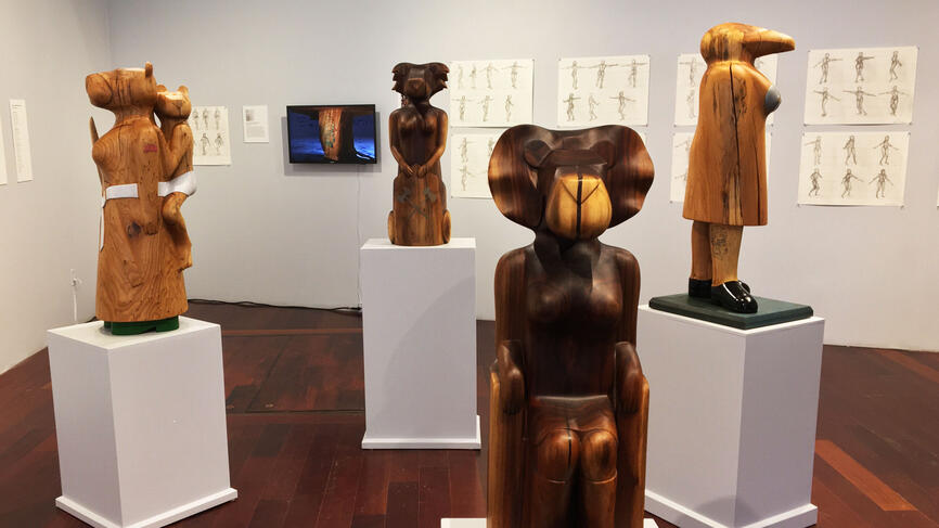 While at Brandeis, Dodson completed a multiyear project that focused on the Amazons of the ancient steppes. Her research for that work, which ranged from art history to archaeology to the pop culture depictions of mythic Amazonians, led her to create a series of wood sculptures that reimagine the figures in Albrecht Durer’s famous woodcut “The Four Horsemen of the Apocalypse” as Amazon warriors. Her four wood sculptures premiered at the Boston Sculptors Gallery in May, in a solo exhibit titled “Amazons Among Us.”