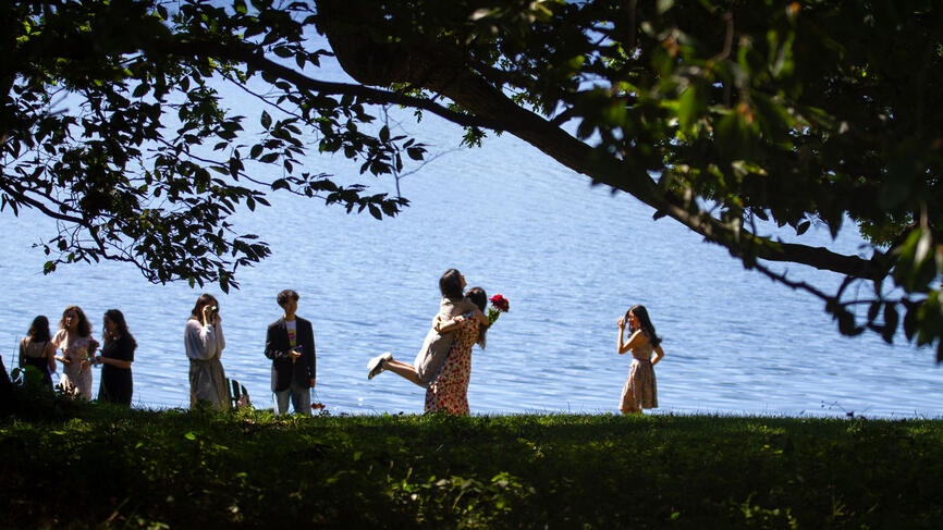 Several students marked the occasion by walking to Lake Waban and taking photos.