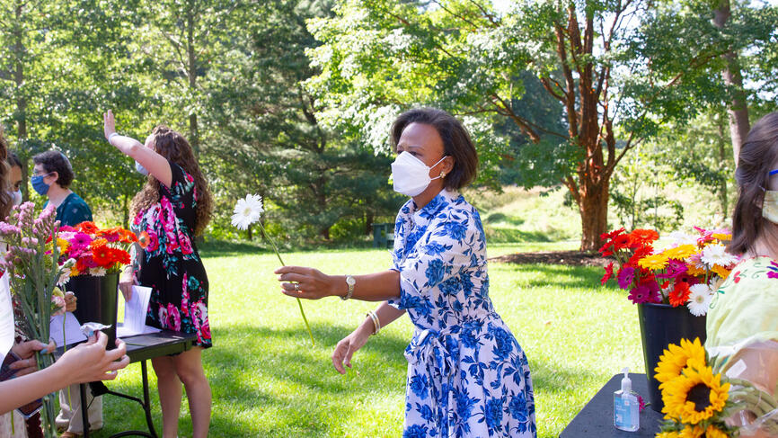 President Paula A. Johnson joined the tradition in handing out flowers. She and Dean Sheilah Horton gave a reading during the festivities.