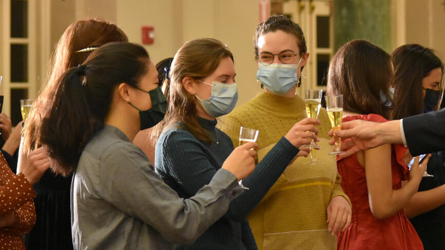 On December 15, Wellesley seniors who completed their degree requirements this semester were honored in a ceremony in Alumnae Hall. The College’s newest alumnae were celebrated by Wellesley’s senior leadership and members of the class of 2022 class council. Kathryn Harvey Mackintosh ’03, executive director of the College’s Alumnae Association, welcomed them into Wellesley’s alumnae community, and Dean of Students Sheilah Shaw Horton toasted the group with cider at the close of the event.
