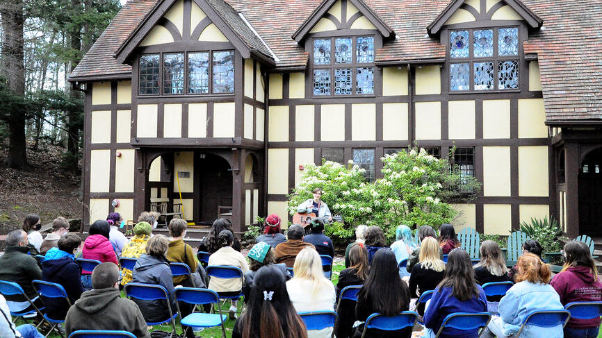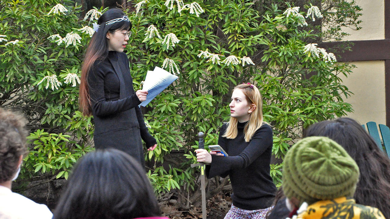 On the lawn outside the Shakespeare Society’s house on a sunny Friday afternoon, a group of Wellesley faculty and students gathered to celebrate the famous bard. Familiar scenes and sonnets were on the program, but they didn’t sound quite like traditional Shakespeare. Actors performed parts of The Tempest in Arabic and Tamazight and Sonnet 18 in Korean. Hamlet was presented in Spanish and German, and A Midsummer Night’s Dream in Mandarin. This was “Shakespeare in Translation.”