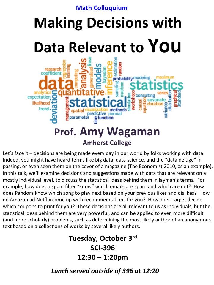 Professor Amy Wagaman of Amherst College will give a colloquium titled "Making Decisions with Data Relevant to You".